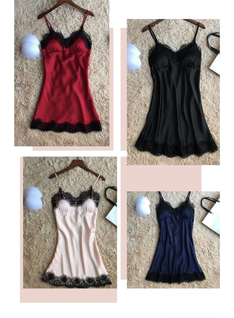 This two-piece lingerie set includes a delicate satin chemise and a matching short robe. The chemise features a deep V-neckline with intricate floral lace trim, thin adjustable spaghetti straps, and a charming ribbon bow at the bust. Its fluid, silky fabric drapes beautifully for a comfortable and flattering fit. The coordinating robe has a relaxed silhouette with wide sleeves, also finished with the same beautiful lace at the cuffs. The set is available in a variety of elegant colors, including black, red, blush, and navy.