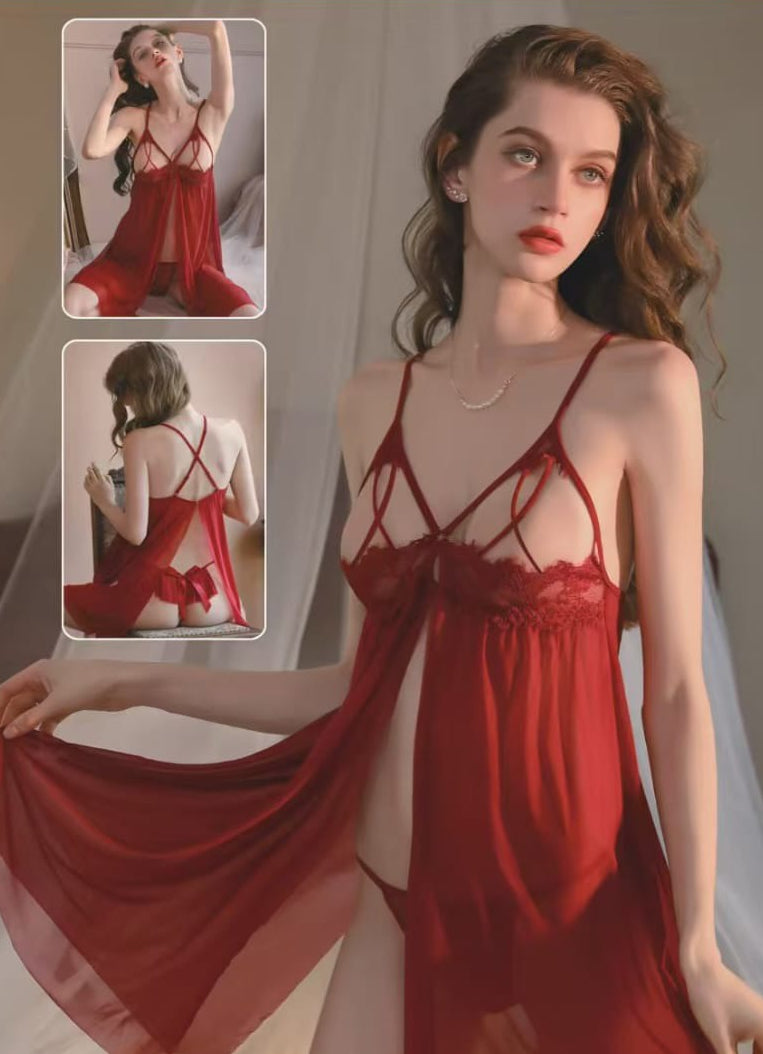 This set is designed for maximum impact and seduction. The combination of the sheer, flowing material, the bold red color, and the highly revealing, strappy open bust makes it a very intense and striking piece of nightwear.
