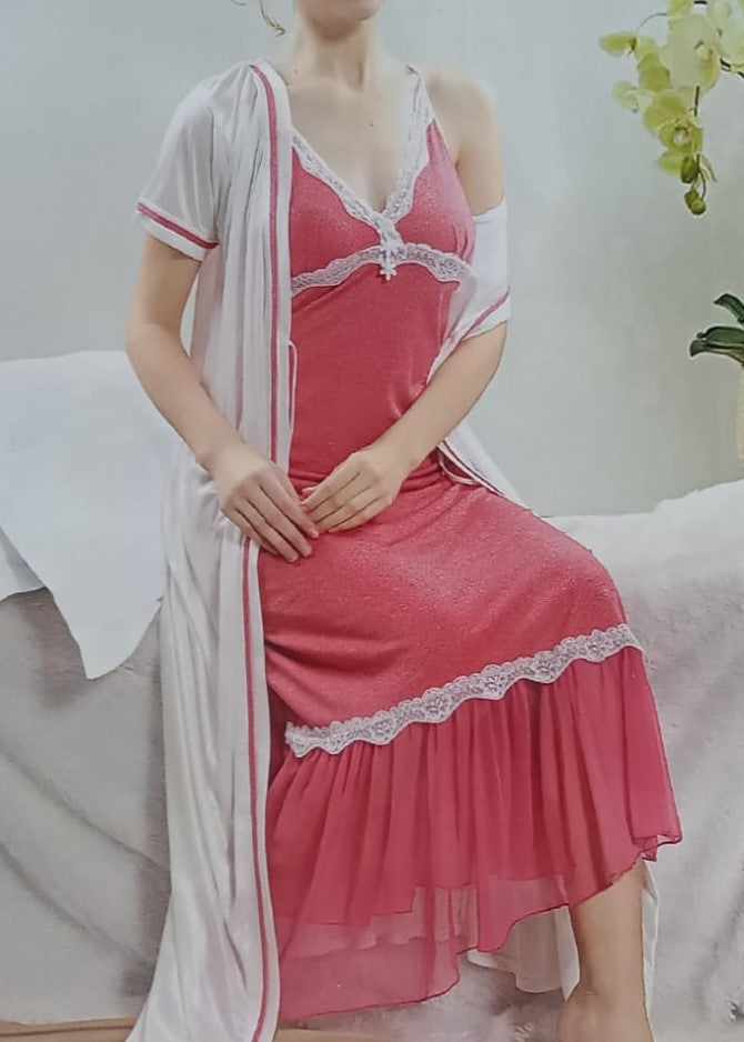 This is a two-piece nightwear set that includes a chemise (nightgown) and a matching robe. The entire set is made from a soft, lightweight fabric that appears to have a subtle sheen and a delicate, mottled pattern.
